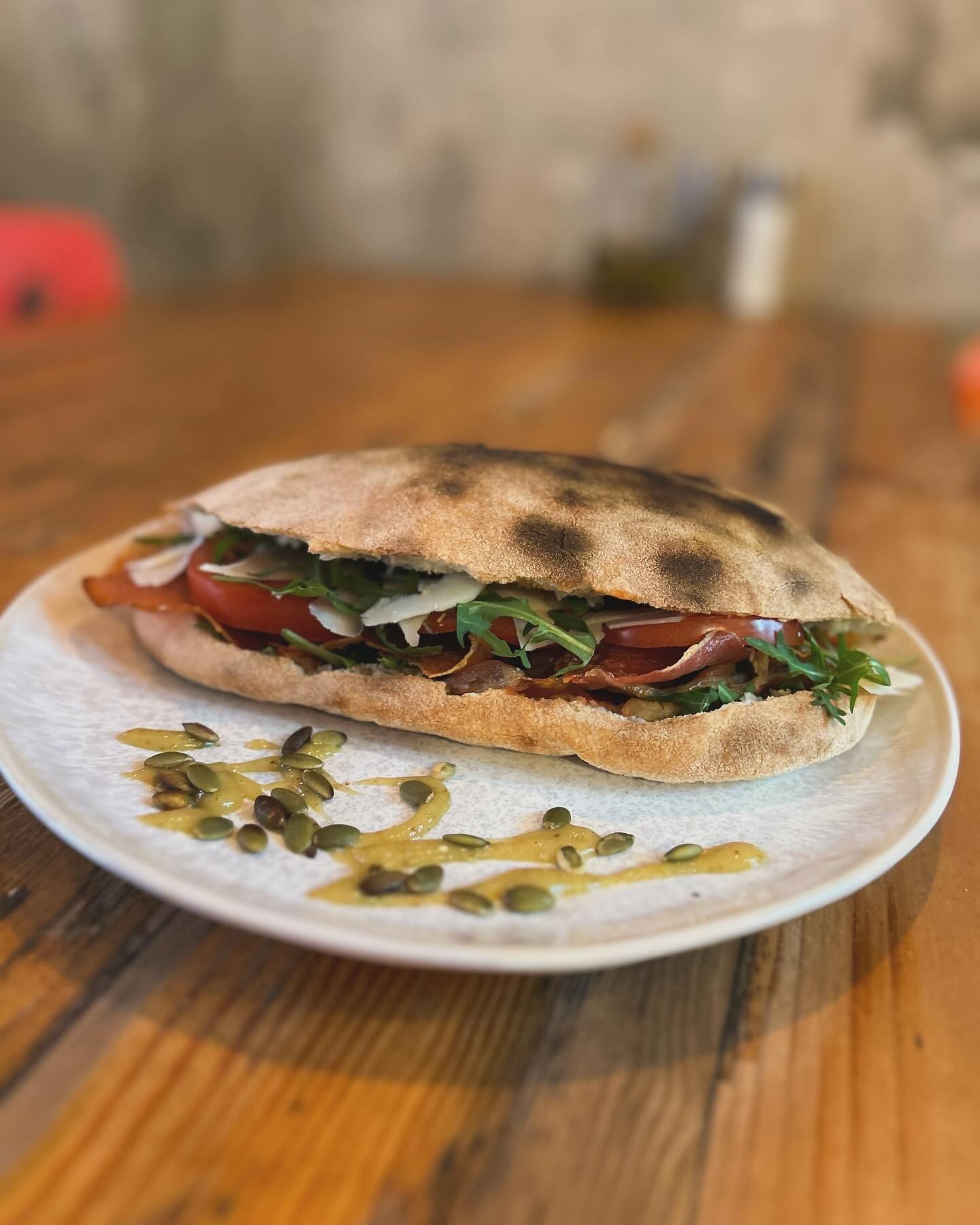MORTADELLA / majonez, pieczona mortadela włoska, karmelizowana cebula, pomidor, mozzarella, mix sałat